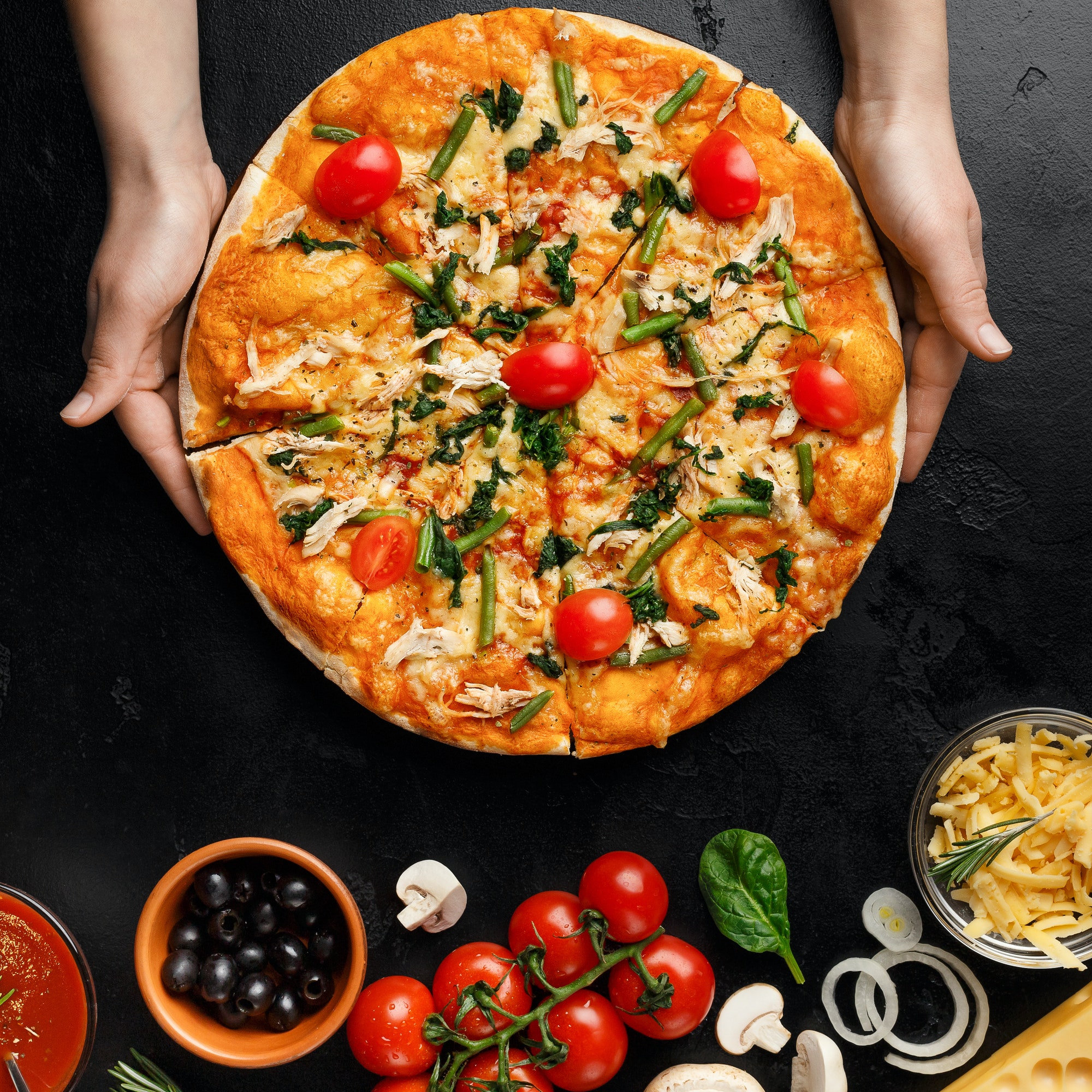Extra virgin olive oil, garlic, mozzarella cheese, onions, mushrooms, green olives, black olives, fresh tomatoes.